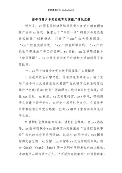 【七哥公文】2025年:【七哥公文】图书馆青少年党史教育阅读推广情况汇报+更多免费公文+VX:QiGeGongWen2024+更多免费公文+VX:QiGeGongWen2024