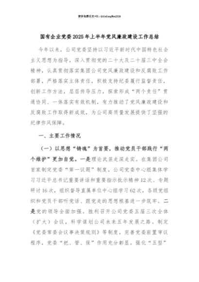 【七哥公文】2025年:【七哥公文】国有企业党委2025年上半年党风廉政建设工作总结+更多免费公文+VX:QiGeGongWen2024+更多免费公文+VX:QiGeGongWen2024