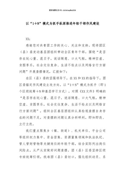 【七哥公文】2025年:【七哥公文】以“1+N”模式为抓手纵深推进年轻干部作风建设+更多免费公文+VX:QiGeGongWen2024+更多免费公文+VX:QiGeGongWen2024