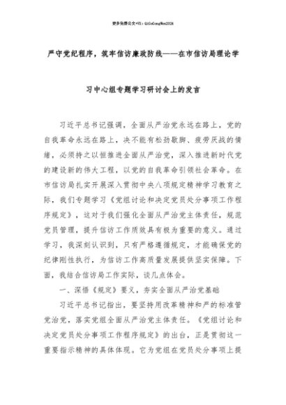 【七哥公文】2025年:【七哥公文】严守党纪程序,筑牢信访廉政防线——在市信访局理论学习中心组专题学习研讨会上的发言+更多免费公文+VX:QiGeGongWen2024+更多免费公文+VX:QiGeGongWen2024