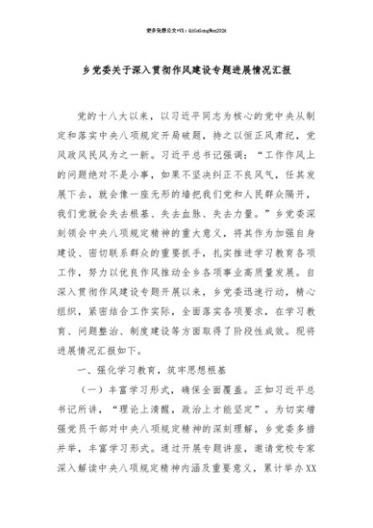 【七哥公文】2025年:【七哥公文】乡党委关于深入贯彻作风建设专题进展情况汇报+更多免费公文+VX:QiGeGongWen2024+更多免费公文+VX:QiGeGongWen2024