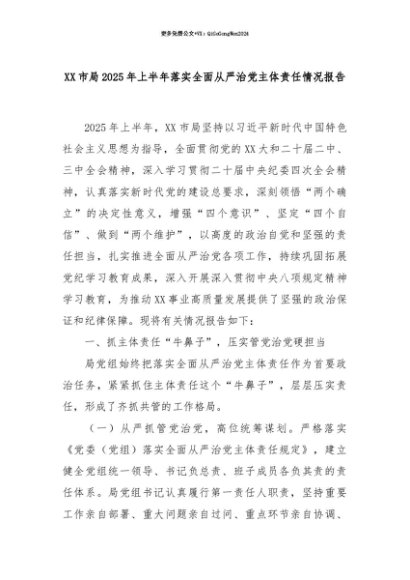 【七哥公文】2025年:【七哥公文】XX市局2025年上半年落实全面从严治党主体责任情况报告+更多免费公文+VX:QiGeGongWen2024+更多免费公文+VX:QiGeGongWen2024