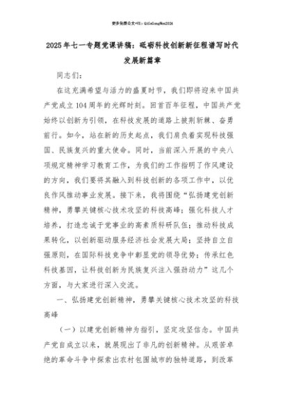 【七哥公文】2025年:【七哥公文】2025年七一专题党课讲稿:砥砺科技创新新征程谱写时代发展新篇章+更多免费公文+VX:QiGeGongWen2024+更多免费公文+VX:QiGeGongWen2024