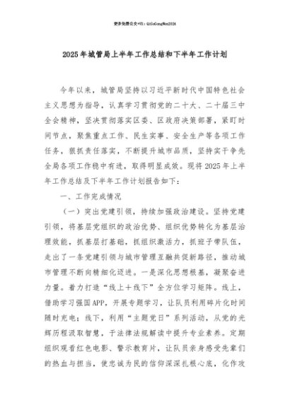 【七哥公文】2025年:【七哥公文】2025年城管局上半年工作总结和下半年工作计划+更多免费公文+VX:QiGeGongWen2024+更多免费公文+VX:QiGeGongWen2024