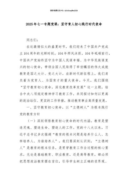 【七哥公文】2025年:【七哥公文】2025年七一专题党课:坚守育人初心践行时代使命+更多免费公文+VX:QiGeGongWen2024+更多免费公文+VX:QiGeGongWen2024