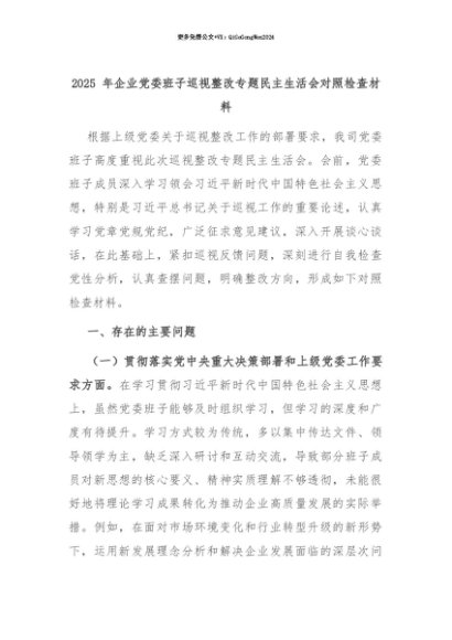 【七哥公文】2025年:【七哥公文】2025 年企业党委班子巡视整改专题民主生活会对照检查材料+更多免费公文+VX:QiGeGongWen2024+更多免费公文+VX:QiGeGongWen2024