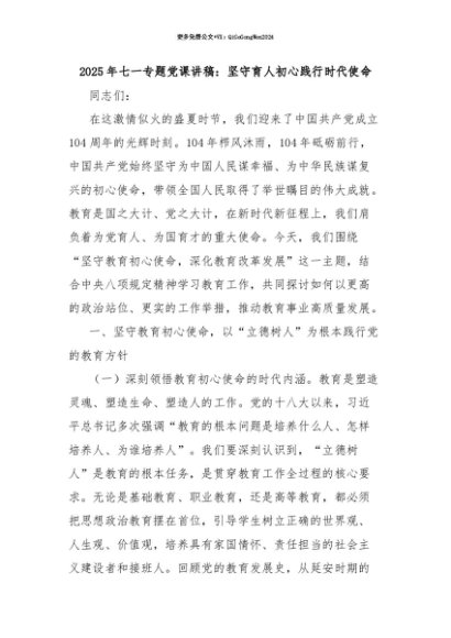 【七哥公文】2025年:【七哥公文】2025年七一专题党课讲稿:坚守育人初心践行时代使命+更多免费公文+VX:QiGeGongWen2024+更多免费公文+VX:QiGeGongWen2024