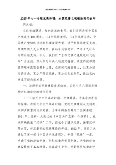 【七哥公文】2025年:【七哥公文】2025年七一专题党课讲稿:永葆纪律之魂锻造时代铁军+更多免费公文+VX:QiGeGongWen2024+更多免费公文+VX:QiGeGongWen2024