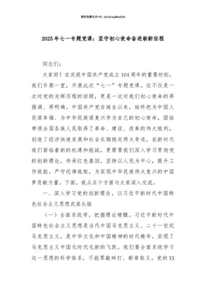 【七哥公文】2025年:【七哥公文】2025年七一专题党课:坚守初心使命奋进崭新征程+更多免费公文+VX:QiGeGongWen2024+更多免费公文+VX:QiGeGongWen2024