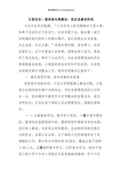 【七哥公文】2025年:【七哥公文】汇报发言:强违规吃喝整治,筑应急廉洁防线+更多免费公文+VX:QiGeGongWen2024+更多免费公文+VX:QiGeGongWen2024