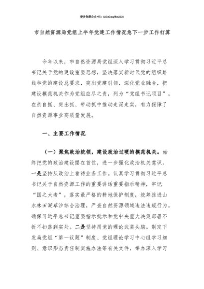 【七哥公文】2025年:【七哥公文】市自然资源局党组上半年党建工作情况及下一步工作打算+更多免费公文+VX:QiGeGongWen2024+更多免费公文+VX:QiGeGongWen2024