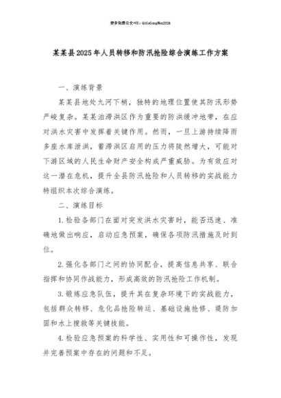 【七哥公文】2025年:【七哥公文】某某县2025年人员转移和防汛抢险综合演练工作方案+更多免费公文+VX:QiGeGongWen2024+更多免费公文+VX:QiGeGongWen2024