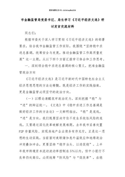 【七哥公文】2025年:【七哥公文】市金融监管局党委书记、局长学习《习近平经济文选》研讨发言交流材料+更多免费公文+VX:QiGeGongWen2024+更多免费公文+VX:QiGeGongWen2024