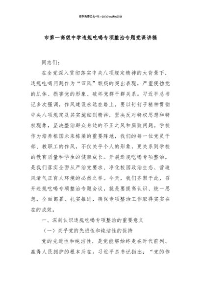 【七哥公文】2025年:【七哥公文】市第一高级中学违规吃喝专项整治专题党课讲稿+更多免费公文+VX:QiGeGongWen2024+更多免费公文+VX:QiGeGongWen2024