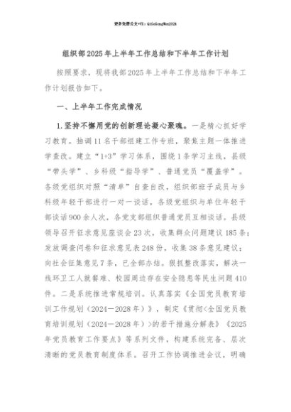 【七哥公文】2025年:【七哥公文】组织部2025年上半年工作总结和下半年工作计划+更多免费公文+VX:QiGeGongWen2024+更多免费公文+VX:QiGeGongWen2024