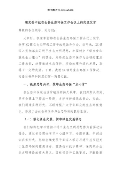 【七哥公文】2025年:【七哥公文】镇党委书记在全县生态环保工作会议上的交流发言+更多免费公文+VX:QiGeGongWen2024+更多免费公文+VX:QiGeGongWen2024