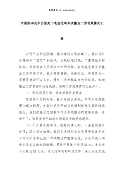 【七哥公文】2025年:【七哥公文】市国防动员办公室关于违规吃喝专项整治工作进展情况汇报+更多免费公文+VX:QiGeGongWen2024+更多免费公文+VX:QiGeGongWen2024