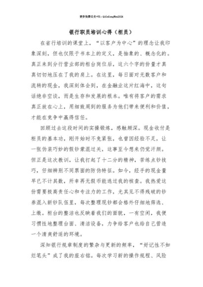 【七哥公文】2025年:【七哥公文】银行职员培训心得(柜员)+更多免费公文+VX:QiGeGongWen2024+更多免费公文+VX:QiGeGongWen2024