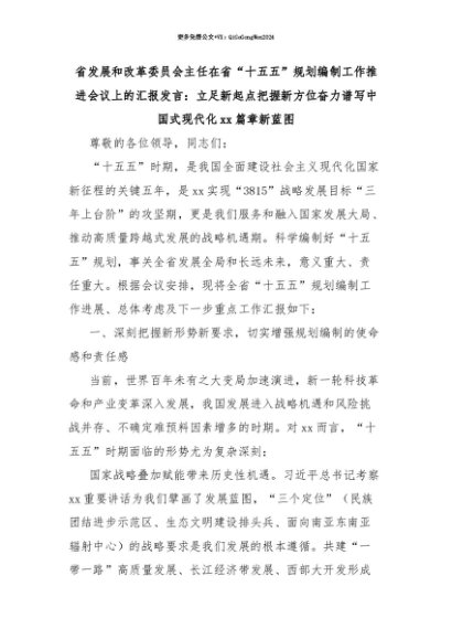 【七哥公文】2025年:【七哥公文】省发展和改革委员会主任在省“十五五”规划编制工作推进会议上的汇报发言:立足新起点把握新方位奋力谱写中国式现代化xx篇章新蓝图+更多免费公文+VX:QiGeGongWen2024+更多免费公文+VX:QiGeGongWen2024