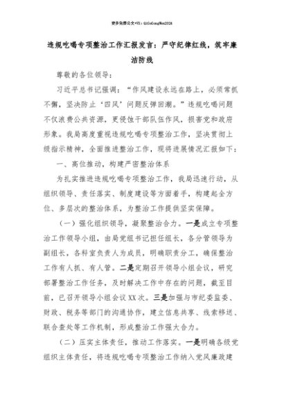 【七哥公文】2025年:【七哥公文】违规吃喝专项整治工作汇报发言:严守纪律红线,筑牢廉洁防线+更多免费公文+VX:QiGeGongWen2024+更多免费公文+VX:QiGeGongWen2024