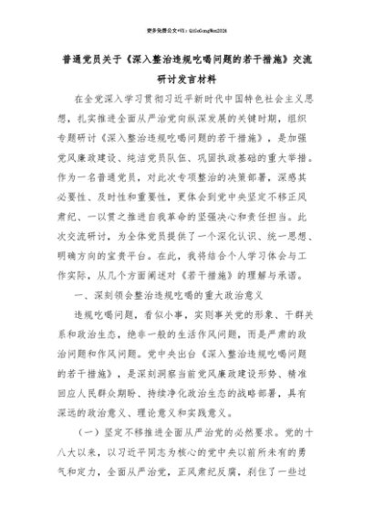 【七哥公文】2025年:【七哥公文】普通党员关于《深入整治违规吃喝问题的若干措施》交流研讨发言材料+更多免费公文+VX:QiGeGongWen2024+更多免费公文+VX:QiGeGongWen2024