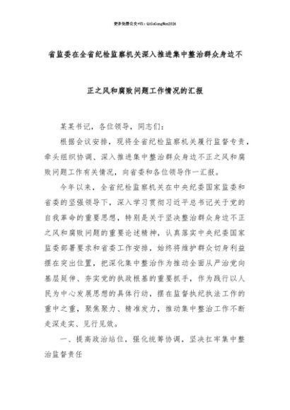 【七哥公文】2025年:【七哥公文】省监委在全省纪检监察机关深入推进集中整治群众身边不正之风和腐败问题工作情况的汇报+更多免费公文+VX:QiGeGongWen2024+更多免费公文+VX:QiGeGongWen2024