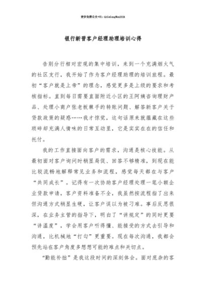 【七哥公文】2025年:【七哥公文】银行新晋客户经理助理培训心得+更多免费公文+VX:QiGeGongWen2024+更多免费公文+VX:QiGeGongWen2024