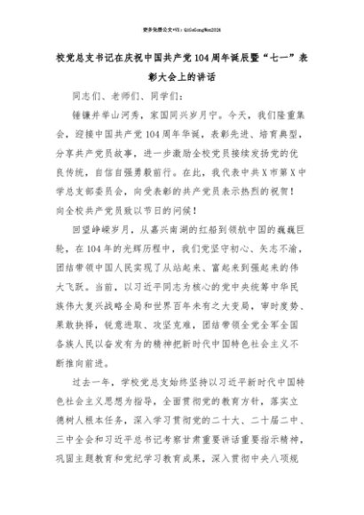 【七哥公文】2025年:【七哥公文】校党总支书记在庆祝中国共产党104周年诞辰暨“七一”表彰大会上的讲话+更多免费公文+VX:QiGeGongWen2024+更多免费公文+VX:QiGeGongWen2024