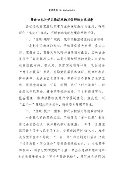 【七哥公文】2025年:【七哥公文】县政协机关党组推动双融互促经验交流材料+更多免费公文+VX:QiGeGongWen2024+更多免费公文+VX:QiGeGongWen2024