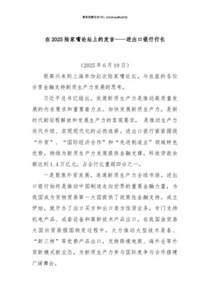 【七哥公文】2025年:【七哥公文】在2025陆家嘴论坛上的发言——进出口银行行长+更多免费公文+VX:QiGeGongWen2024+更多免费公文+VX:QiGeGongWen2024