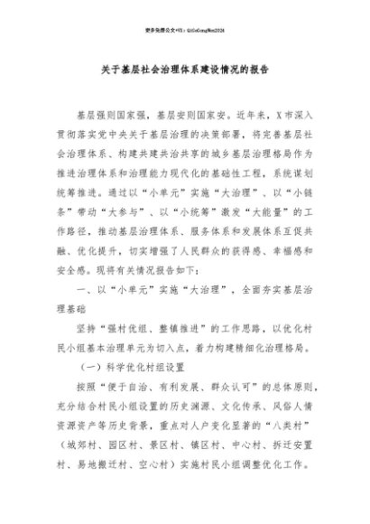 【七哥公文】2025年:【七哥公文】关于基层社会治理体系建设情况的报告+更多免费公文+VX:QiGeGongWen2024+更多免费公文+VX:QiGeGongWen2024