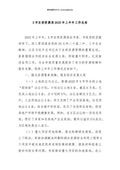 【七哥公文】2025年:【七哥公文】X市自然资源局2025年上半年工作总结+更多免费公文+VX:QiGeGongWen2024+更多免费公文+VX:QiGeGongWen2024