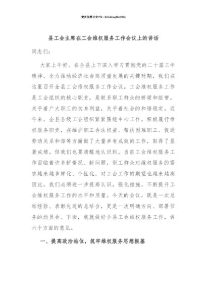 【七哥公文】2025年:【七哥公文】县工会主席在工会维权服务工作会议上的讲话+更多免费公文+VX:QiGeGongWen2024+更多免费公文+VX:QiGeGongWen2024