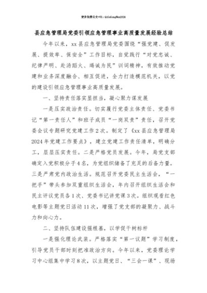 【七哥公文】2025年:【七哥公文】县应急管理局党委引领应急管理事业高质量发展经验总结+更多免费公文+VX:QiGeGongWen2024+更多免费公文+VX:QiGeGongWen2024