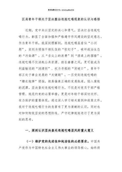 【七哥公文】2025年:【七哥公文】区局青年干部关于坚决整治违规吃喝现象的认识与感悟+更多免费公文+VX:QiGeGongWen2024+更多免费公文+VX:QiGeGongWen2024