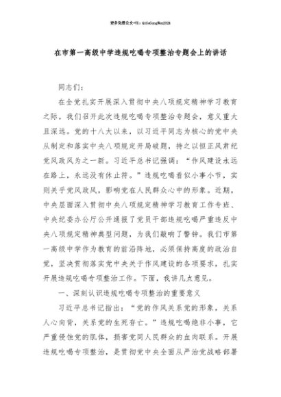 【七哥公文】2025年:【七哥公文】在市第一高级中学违规吃喝专项整治专题会上的讲话+更多免费公文+VX:QiGeGongWen2024+更多免费公文+VX:QiGeGongWen2024