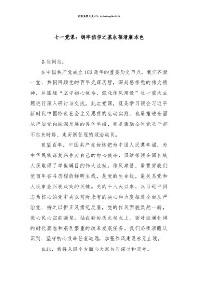 【七哥公文】2025年:【七哥公文】七一党课:铸牢信仰之基永葆清廉本色+更多免费公文+VX:QiGeGongWen2024+更多免费公文+VX:QiGeGongWen2024