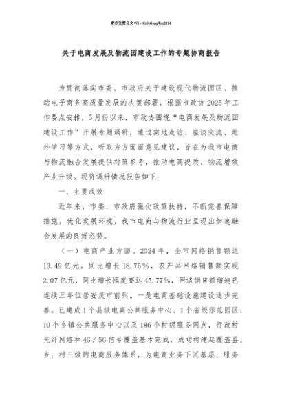 【七哥公文】2025年:【七哥公文】关于电商发展及物流园建设工作的专题协商报告+更多免费公文+VX:QiGeGongWen2024+更多免费公文+VX:QiGeGongWen2024