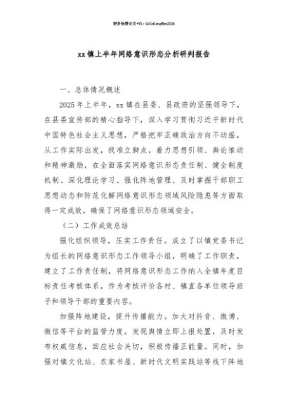 【七哥公文】2025年:【七哥公文】xx镇上半年网络意识形态分析研判报告+更多免费公文+VX:QiGeGongWen2024+更多免费公文+VX:QiGeGongWen2024