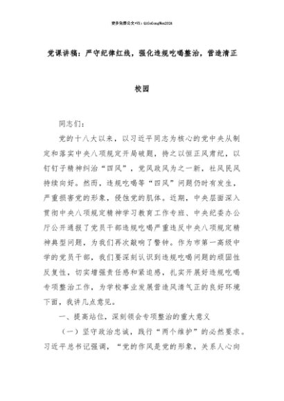 【七哥公文】2025年:【七哥公文】党课讲稿:严守纪律红线,强化违规吃喝整治,营造清正校园+更多免费公文+VX:QiGeGongWen2024+更多免费公文+VX:QiGeGongWen2024