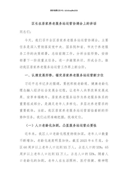 【七哥公文】2025年:【七哥公文】区长在居家养老服务站运营协调会上的讲话+更多免费公文+VX:QiGeGongWen2024+更多免费公文+VX:QiGeGongWen2024