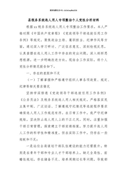 【七哥公文】2025年:【七哥公文】县税务系统选人用人专项整治个人党性分析材料+更多免费公文+VX:QiGeGongWen2024+更多免费公文+VX:QiGeGongWen2024