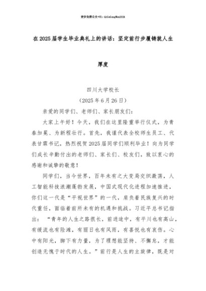 【七哥公文】2025年:【七哥公文】在2025届学生毕业典礼上的讲话:坚定前行步履铸就人生厚度+更多免费公文+VX:QiGeGongWen2024+更多免费公文+VX:QiGeGongWen2024