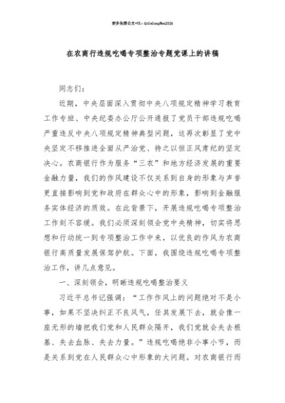 【七哥公文】2025年:【七哥公文】在农商行违规吃喝专项整治专题党课上的讲稿+更多免费公文+VX:QiGeGongWen2024+更多免费公文+VX:QiGeGongWen2024