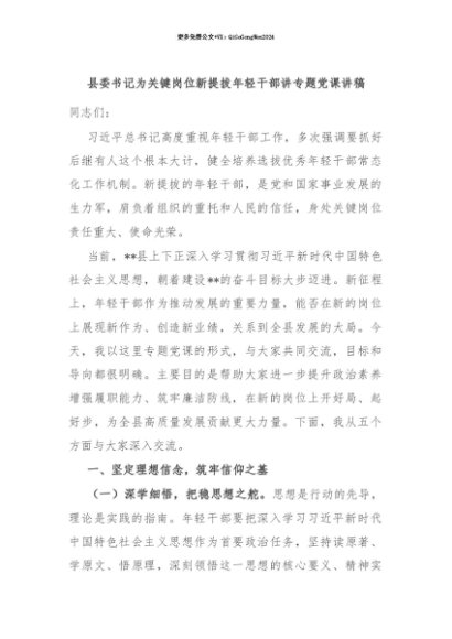 【七哥公文】2025年:【七哥公文】县委书记为关键岗位新提拔年轻干部讲专题党课讲稿+更多免费公文+VX:QiGeGongWen2024+更多免费公文+VX:QiGeGongWen2024