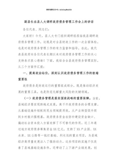 【七哥公文】2025年:【七哥公文】副县长在县人大调研政府债务管理工作会上的讲话+更多免费公文+VX:QiGeGongWen2024+更多免费公文+VX:QiGeGongWen2024