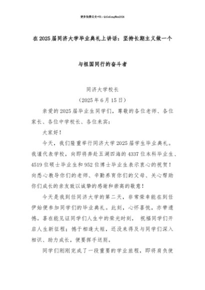 【七哥公文】2025年:【七哥公文】在2025届同济大学毕业典礼上讲话:坚持长期主义做一个与祖国同行的奋斗者+更多免费公文+VX:QiGeGongWen2024+更多免费公文+VX:QiGeGongWen2024