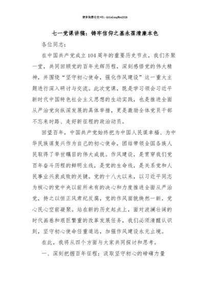 【七哥公文】2025年:【七哥公文】七一党课讲稿:铸牢信仰之基永葆清廉本色+更多免费公文+VX:QiGeGongWen2024+更多免费公文+VX:QiGeGongWen2024