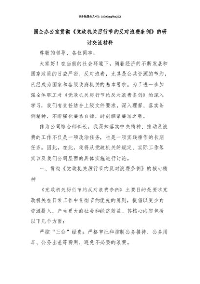 【七哥公文】2025年:【七哥公文】国企办公室贯彻《党政机关厉行节约反对浪费条例》的研讨交流材料+更多免费公文+VX:QiGeGongWen2024+更多免费公文+VX:QiGeGongWen2024