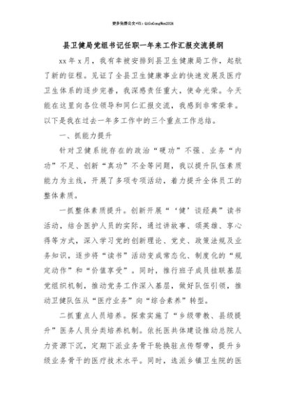 【七哥公文】2025年:【七哥公文】县卫健局党组书记任职一年来工作汇报交流提纲+更多免费公文+VX:QiGeGongWen2024+更多免费公文+VX:QiGeGongWen2024